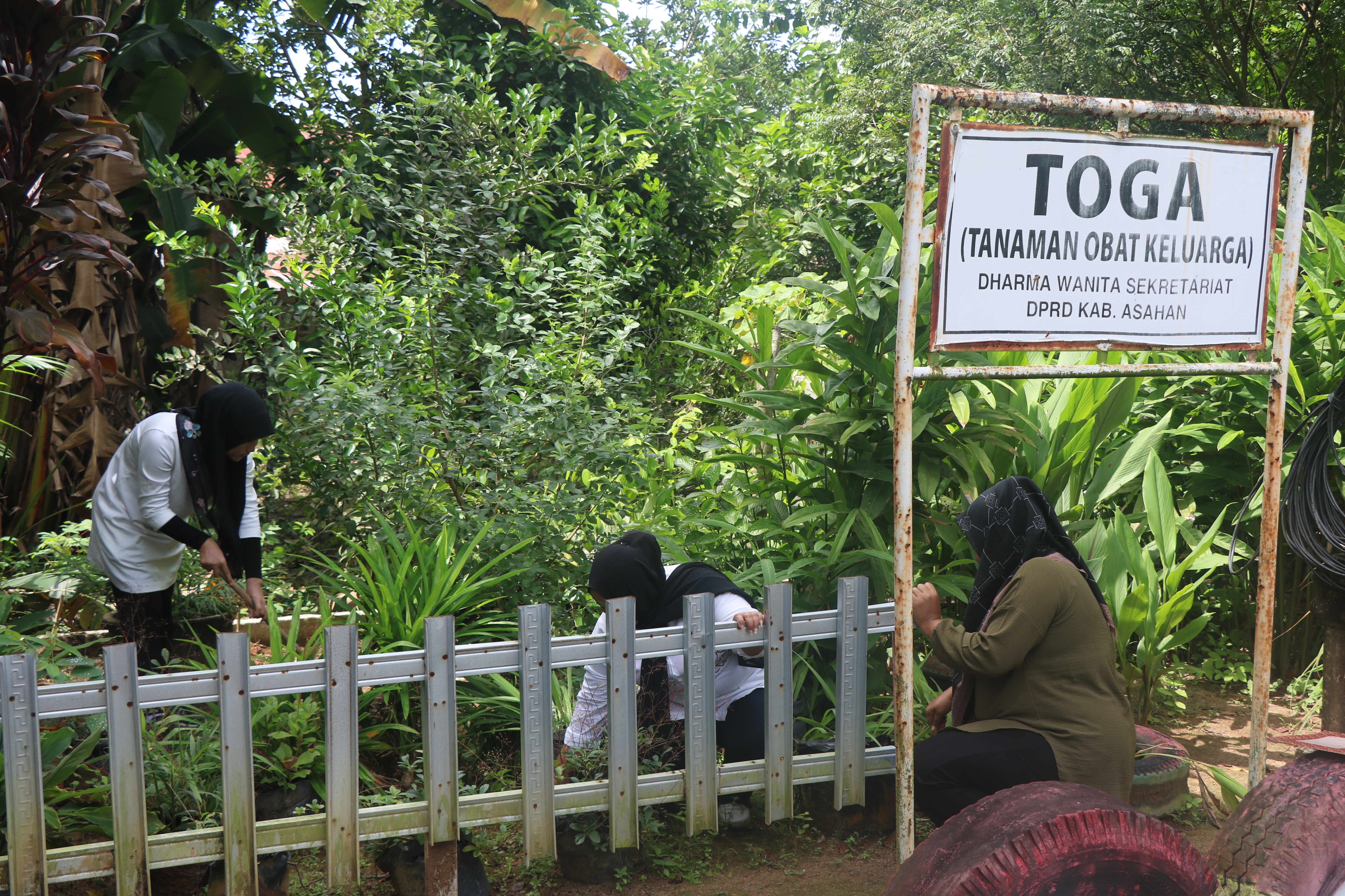 KISARAN - Anggota Dharma Wanita Persatuan Unsur Pelaksana (DWP UP) Sekretariat DPRD Kabupaten Asahan melakukan perawatan rutin Taman obat keluarga (TOGA) di pelataran Kantor DPRD Kabupaten Asahan, Rabu (10/7/2024).