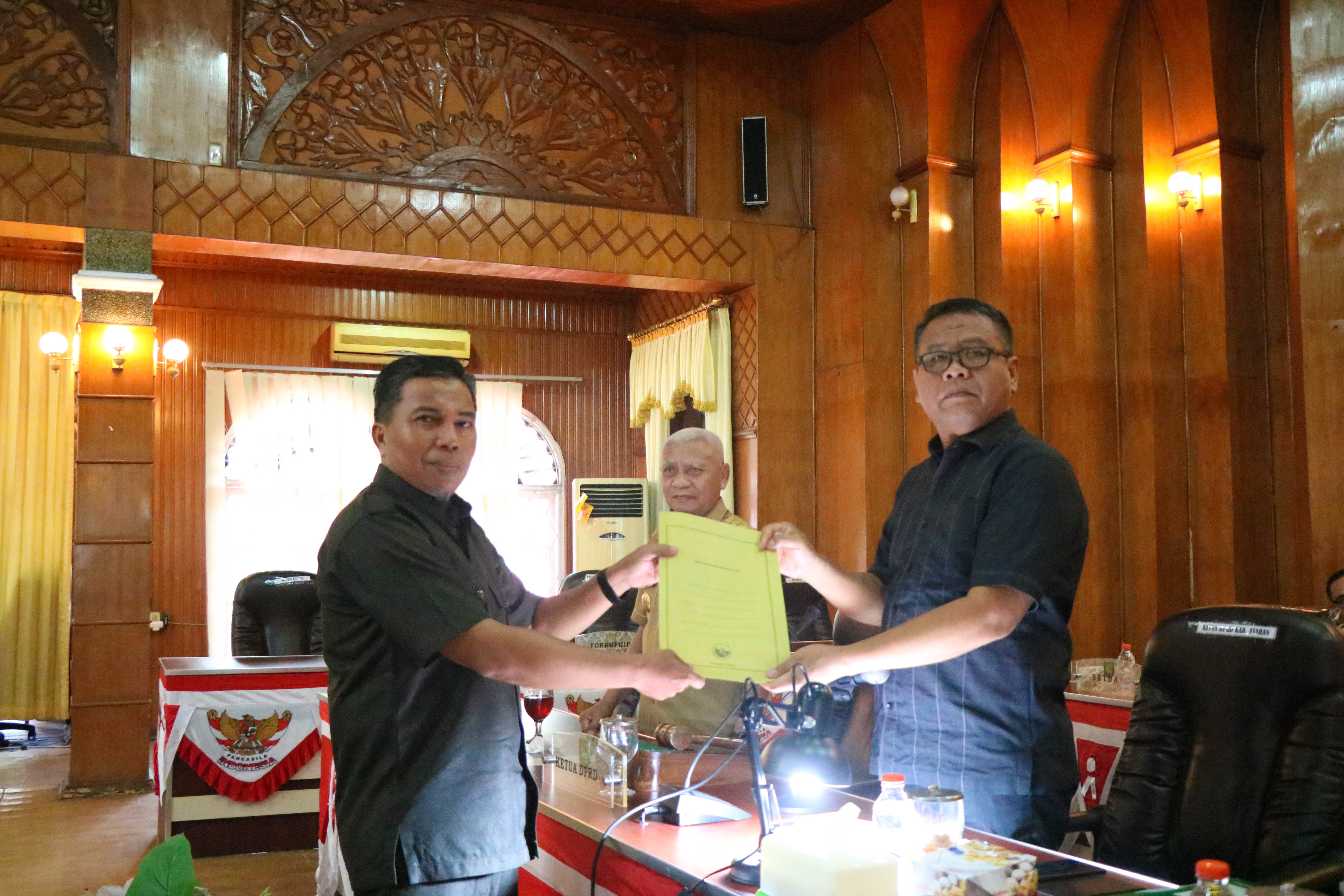 KISARAN - DPRD Kabupaten Asahan menggelar Rapat Paripurna dalam acara Penyampaian Pemandangan Umum Fraksi DPRD Kabupaten Asahan terhadap Rancangan Perda Kabupaten Asahan tentang Pemilihan Kepala Desa, Senin (16/10/2023), di Aula Rambate Rata Raya, lantai dua Kantor DPRD Kabupaten Asahan.