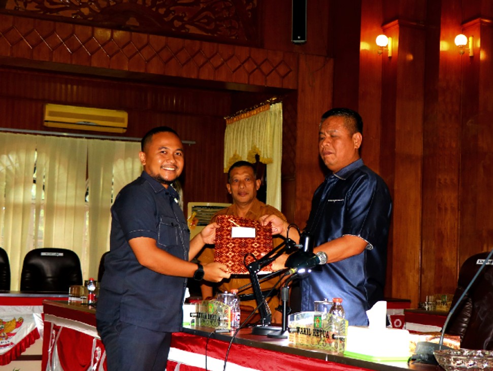 KISARAN - Ketua DPRD Kabupaten Asahan Baharuddin Harahap, SH, MH. menandatangani Keputusan DPRD Kabupaten Asahan tentang Penetapan Usul Ranperda Kabupaten Asahan menjadi Prakarsa DPRD Kabupaten Asahan pada Rapat Paripurna di Aula Rambate Rata Raya Sekretariat DPRD Kabupaten Asahan, Senin (21/8/2023).