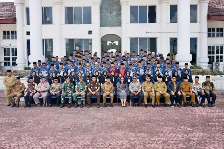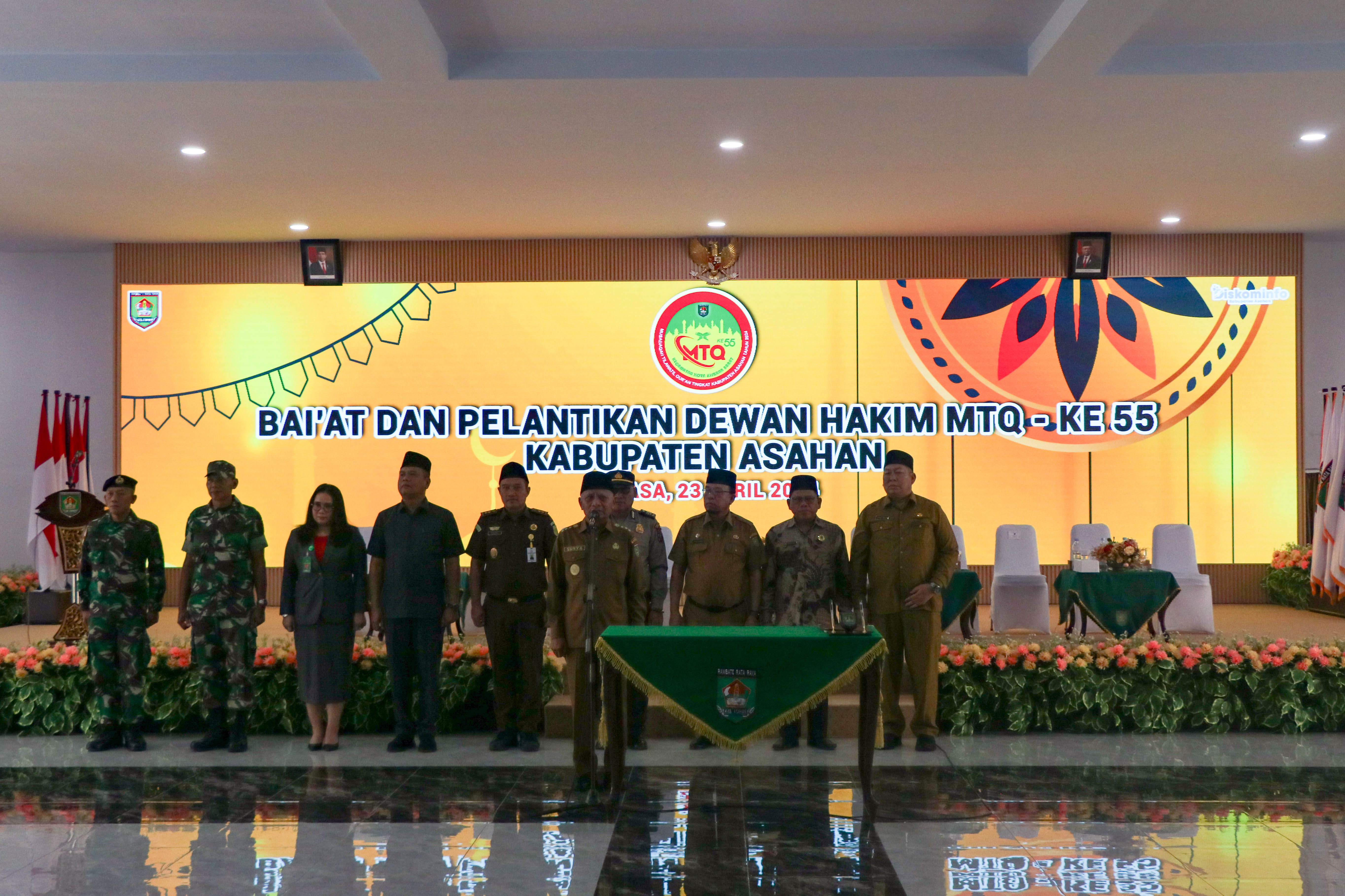 Kisaran - Ketua DPRD Kabupaten Asahan bersama Forkopimda Kabupaten Asahan menghadiri acara Bai’at dan Pelantikan Dewan Hakim MTQ ke 55 Kabupaten Asahan di Aula Melati Kantor Bupati Asahan, Selasa (23/04/2024).