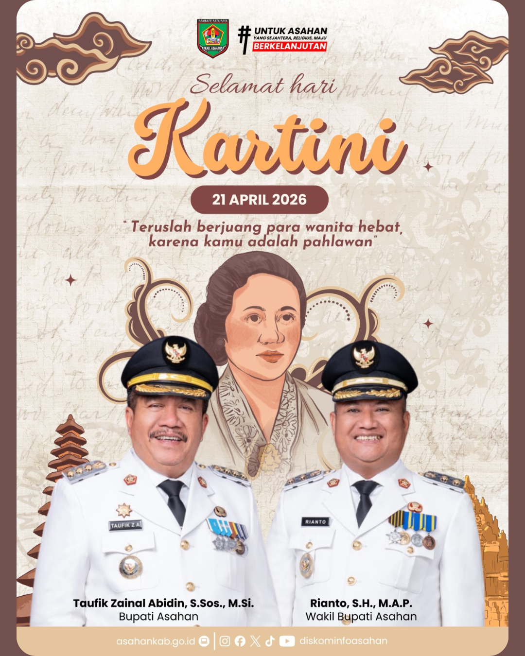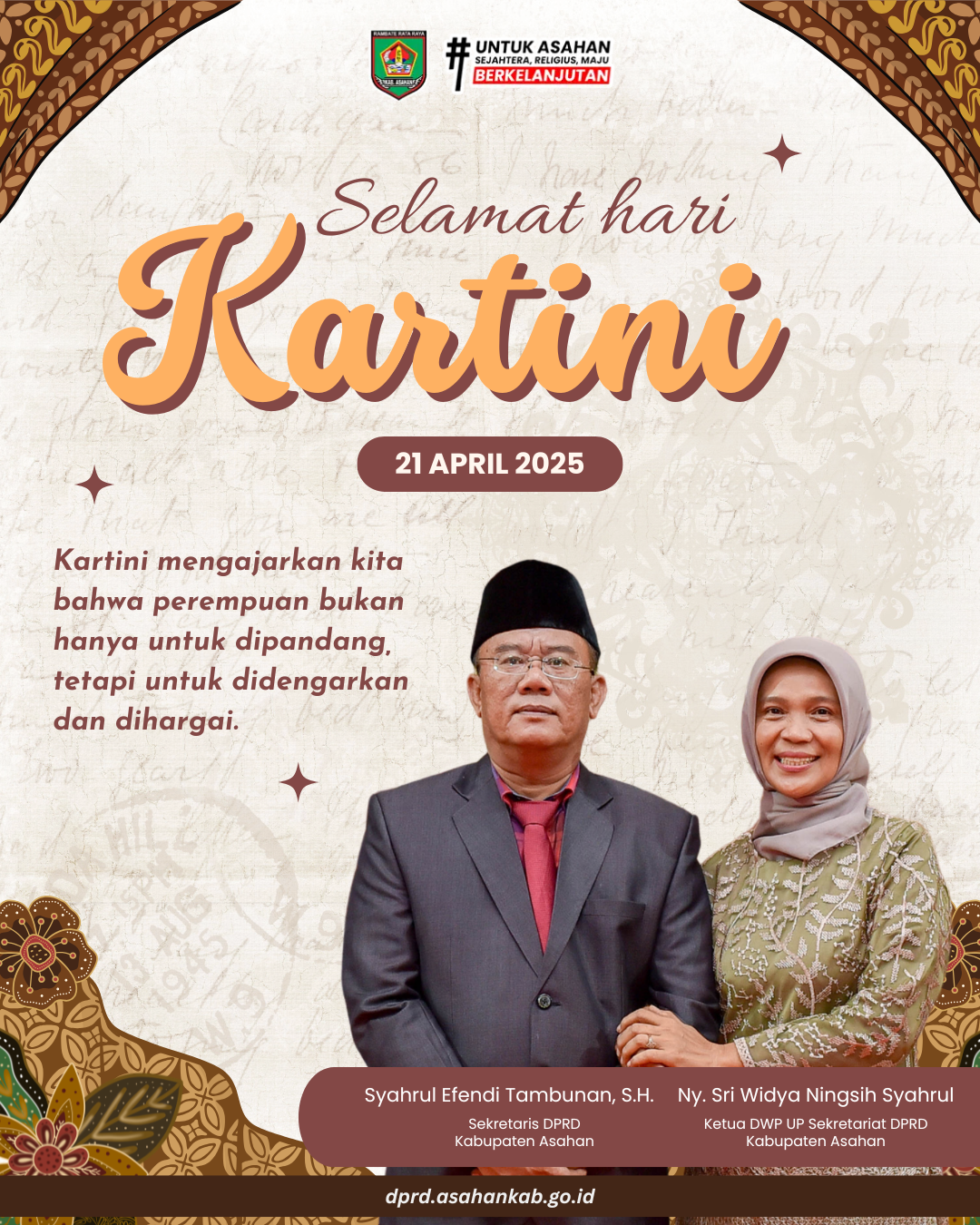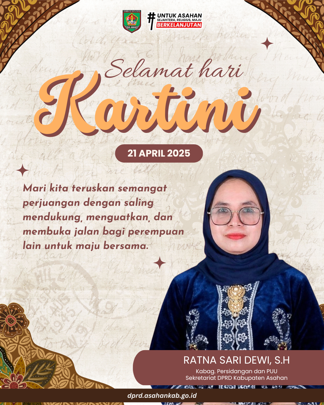 Dalam memperingati Hari Kartini, 21 April 2026, mari kita jadikan momentum ini untuk memberikan apresiasi setinggi-tingginya kepada seluruh wanita hebat, khususnya di Kabupaten Asahan, yang terus berkarya dan memberikan kontribusi nyata bagi keluarga, masyarakat, dan bangsa.