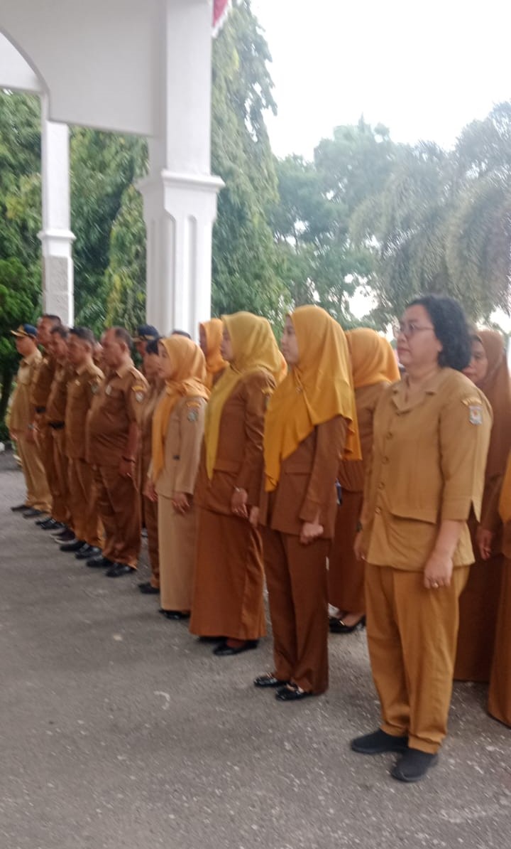 KISARAN - Kepala Bagian Program dan Keuangan Sekretariat DPRD Kabupaten Asahan Ir. Roger Situmorang memimpin apel pagi di halaman kantor DPRD Kabupaten Asahan, Senin (7/10/2024).