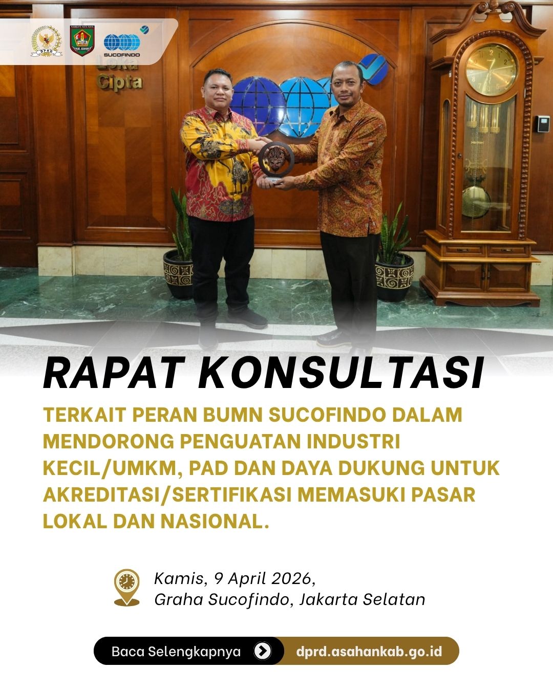 Jakarta, dprd.asahankab.go.id - Dalam upaya mendorong penguatan sektor ekonomi daerah, Wakil Ketua DPRD Kabupaten Asahan, Rosmansyah, melakukan kunjungan konsultasi ke Graha SUCOFINDO, Jakarta Selatan pada Kamis (9/4). Pertemuan ini fokus pada optimalisasi peran PT SUCOFINDO (Persero) sebagai BUMN bidang Testing, Inspection, and Certification (TIC) dalam mendukung pelaku industri kecil dan UMKM di Kabupaten Asahan.