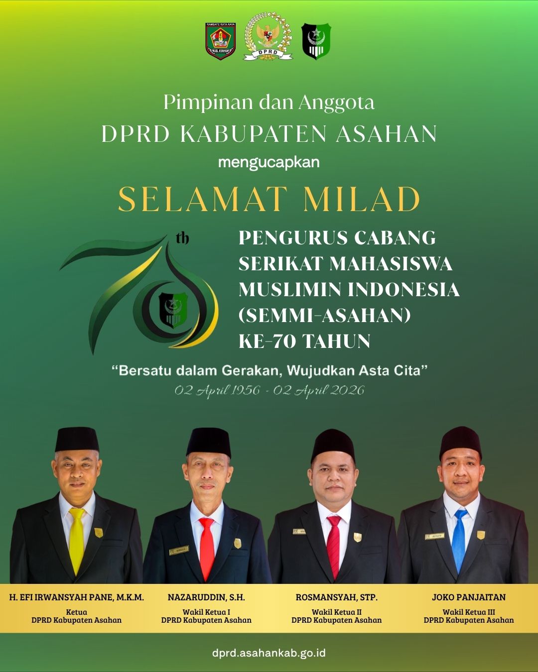 Pimpinan dan Anggota DPRD Kabupaten Asahan mengucapkan Selamat Milad yang ke-70 kepada Pengurus Cabang Serikat Mahasiswa Muslimin Indonesia (SEMMI) Kabupaten Asahan. (02 April1956- 02 April 2026)