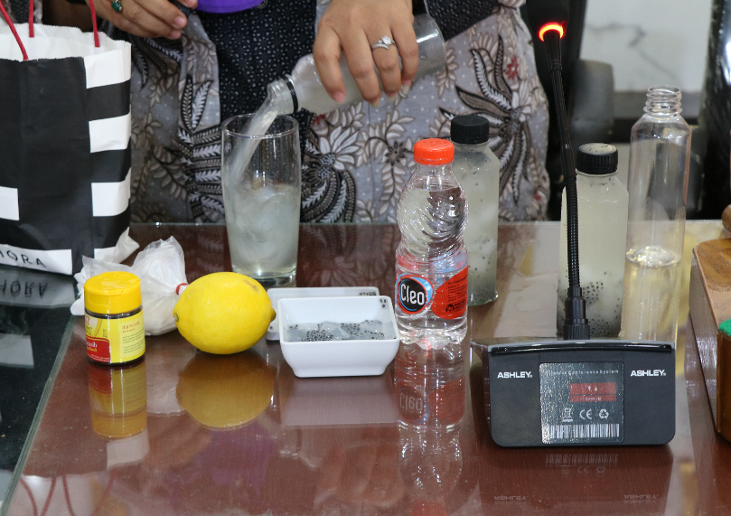 Suci Setiyani Panjaitan selaku Kepala Bagian Fasilitasi Penganggaran dan Pengawasan Sekretariat DPRD Kabupaten Asahan melakukan demonstrasi kursus pembuatan Minuman kesehatan dan kecantikan dengan bahan dasar lemon dan mint.