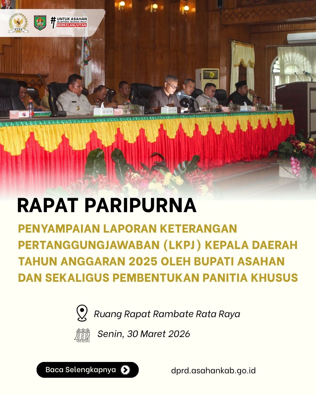 Kisaran, dprd.asahankab.go.id - Dewan Perwakilan Rakyat Daerah (DPRD) Kabupaten Asahan melaksanakan rapat paripurna dalam acara Penyampaian Laporan Keterangan Pertanggungjawaban (LKPJ) Kepala Daerah Tahun Anggaran 2025 Oleh Bupati Asahan Dan Sekaligus Pembentukan Panitia Khusus pada Senin (30/03/2026) ruang rapat Paripurna Rambate Rata Raya, Kantor DPRD Kabupaten Asahan.