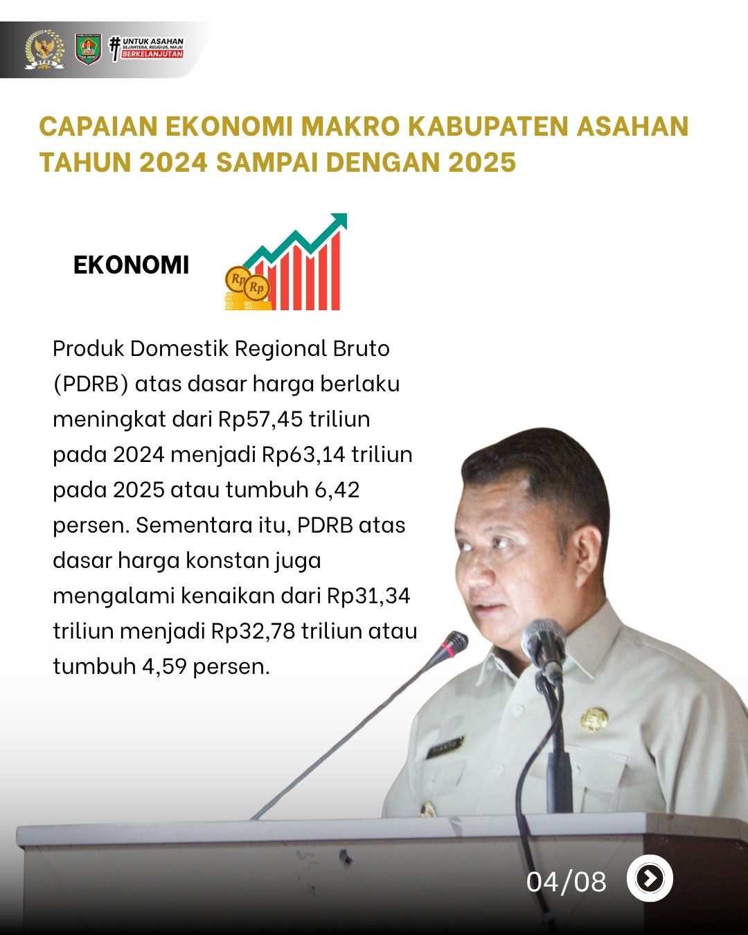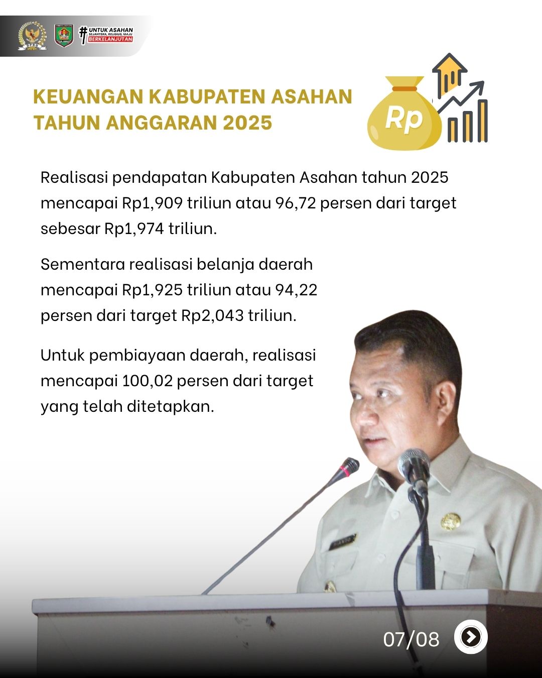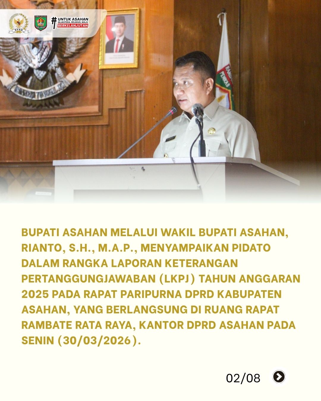 Bupati Asahan melalui Wakil Bupati Asahan, Rianto, S.H., M.A.P., menyampaikan pidato dalam rangka Laporan Keterangan Pertanggungjawaban (LKPJ) Bupati Asahan Tahun Anggaran 2025 yang memuat capaian indikator makro, realisasi keuangan, serta progres 9 program prioritas pembangunan daerah.