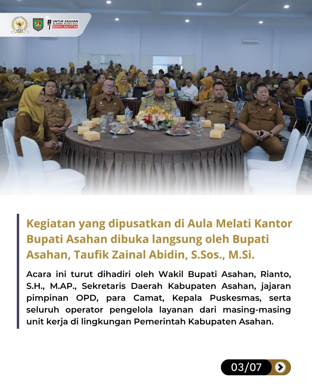 Kegiatan yang dipusatkan di Aula Melati Kantor Bupati Asahan pada Senin (13/04/2026) tersebut dibuka langsung oleh Bupati Asahan, Taufik Zainal Abidin, S.Sos., M.Si. Acara ini turut dihadiri oleh Wakil Bupati Asahan, Rianto, S.H., M.AP., Sekretaris Daerah Kabupaten Asahan, jajaran pimpinan OPD, para Camat, Kepala Puskesmas, serta seluruh operator pengelola layanan dari masing-masing unit kerja di lingkungan Pemerintah Kabupaten Asahan.