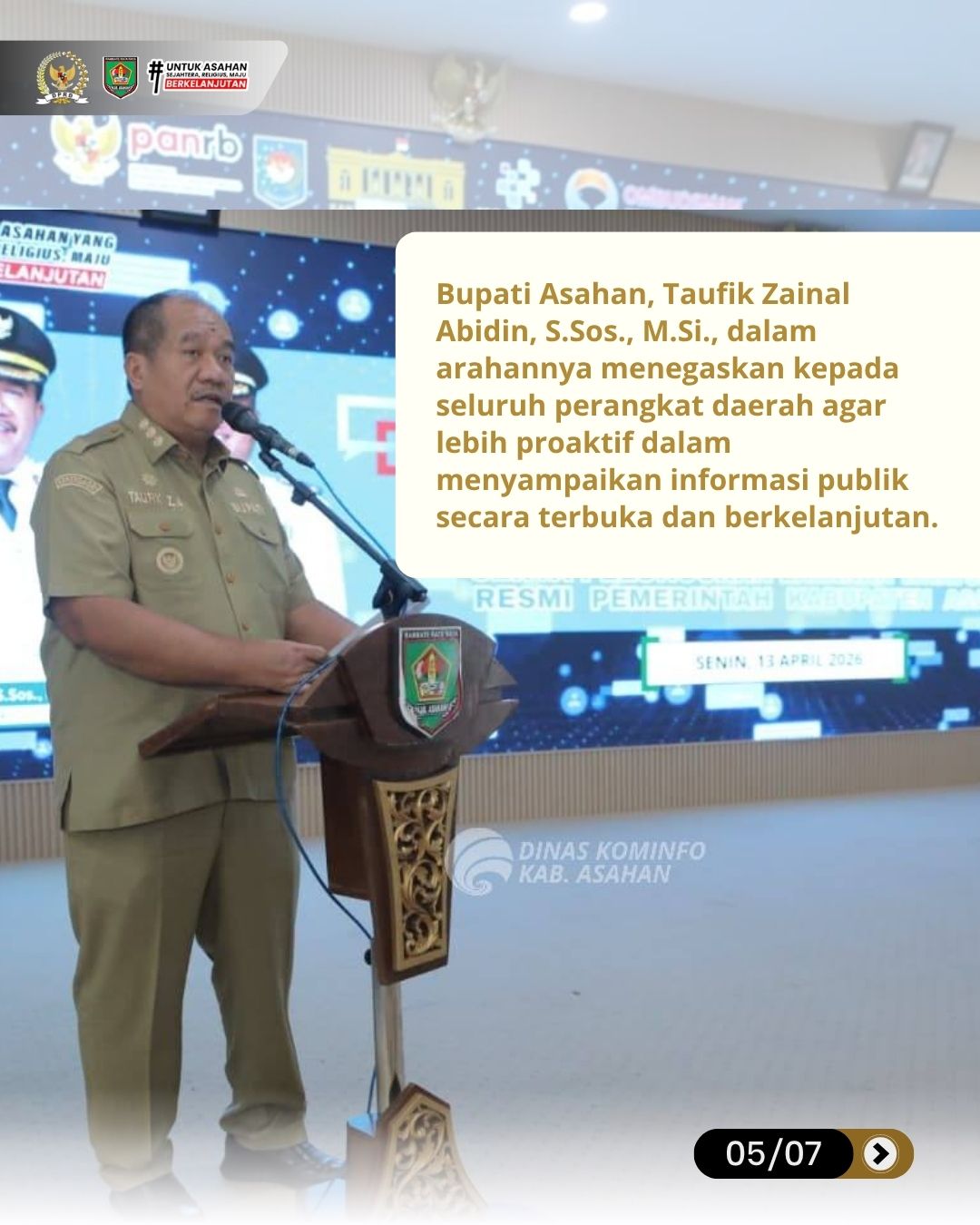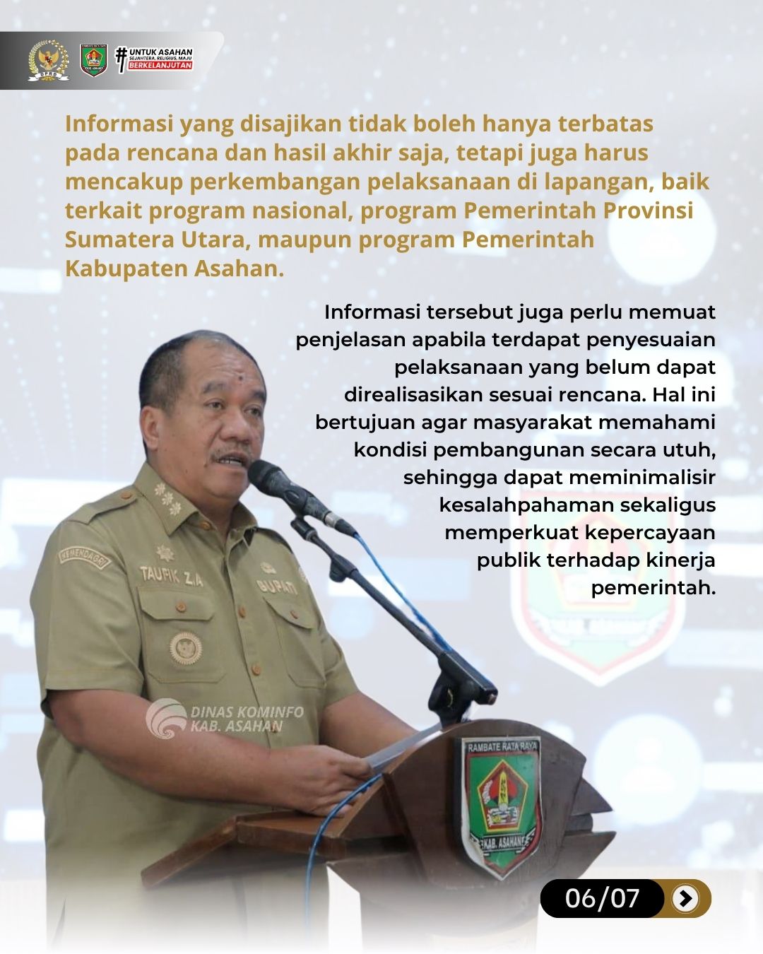 Bupati Asahan, Taufik Zainal Abidin, S.Sos., M.Si., dalam arahannya menegaskan kepada seluruh perangkat daerah agar lebih proaktif dalam menyampaikan informasi publik secara terbuka dan berkelanjutan. Informasi yang disajikan tidak boleh hanya terbatas pada rencana dan hasil akhir saja, tetapi juga harus mencakup perkembangan pelaksanaan di lapangan, baik terkait program nasional, program Pemerintah Provinsi Sumatera Utara, maupun program Pemerintah Kabupaten Asahan.