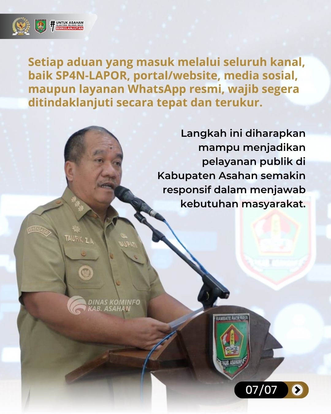Menutup arahannya, Bupati menginstruksikan agar setiap aduan yang masuk melalui seluruh kanal, baik SP4N-LAPOR, portal/website, media sosial, maupun layanan WhatsApp resmi, wajib segera ditindaklanjuti secara tepat dan terukur. Langkah ini diharapkan mampu menjadikan pelayanan publik di Kabupaten Asahan semakin responsif dalam menjawab kebutuhan masyarakat.
