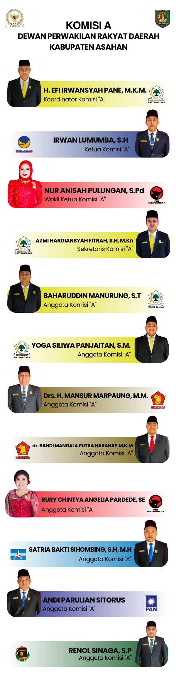 Berdasarkan Keputusan Dewan Perwakilan Rakyat Daerah Kabupaten Asahan Nomor 16 Tahun 2025 Tentang Penetapan Komisi Dewan Perwakilan Rakyat Daerah, bahwa Susunan Keanggotaan Komisi A Masa Jabatan 2024–2029, terhitung sejak tanggal 30 Desember 2025 sampai dengan sekarang, adalah sebagai berikut: