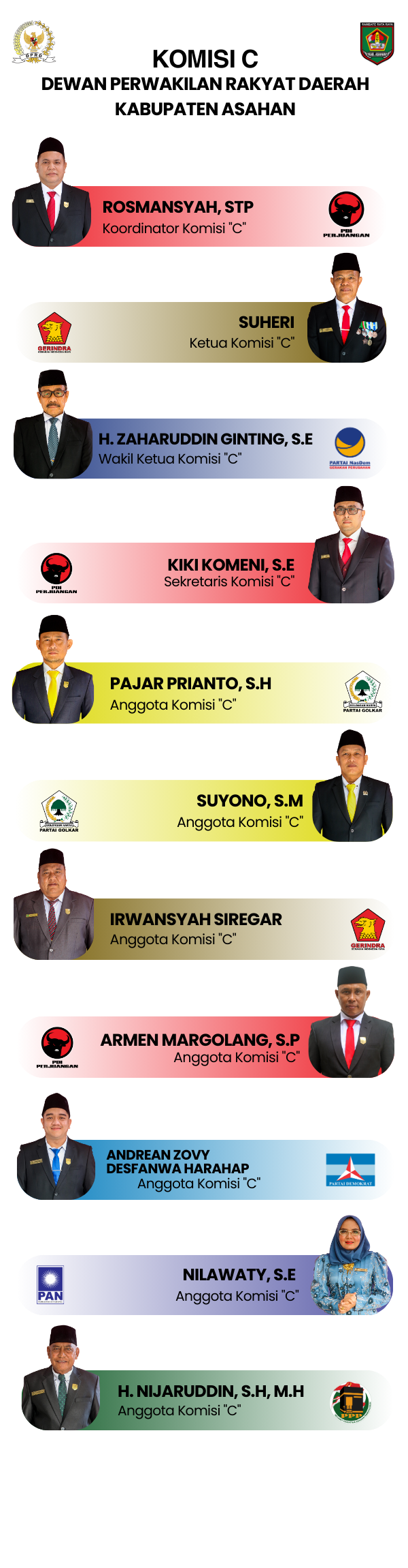 Berdasarkan Keputusan Dewan Perwakilan Rakyat Daerah Kabupaten Asahan Nomor 16 Tahun 2025 Tentang Penetapan Komisi Dewan Perwakilan Rakyat Daerah, bahwa Susunan Keanggotaan Komisi C Masa Jabatan 2024–2029, terhitung sejak tanggal 30 Desember 2025 sampai dengan sekarang, adalah sebagai berikut: