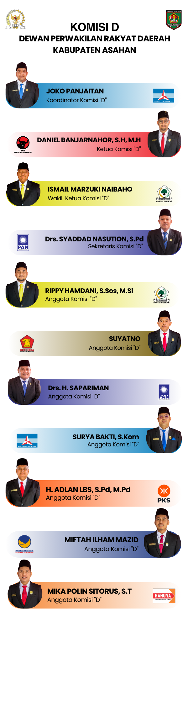 Berdasarkan Keputusan Dewan Perwakilan Rakyat Daerah Kabupaten Asahan Nomor 16 Tahun 2025 Tentang Penetapan Komisi Dewan Perwakilan Rakyat Daerah, bahwa Susunan Keanggotaan Komisi D Masa Jabatan 2024–2029, terhitung sejak tanggal 30 Desember 2025 sampai dengan sekarang, adalah sebagai berikut: